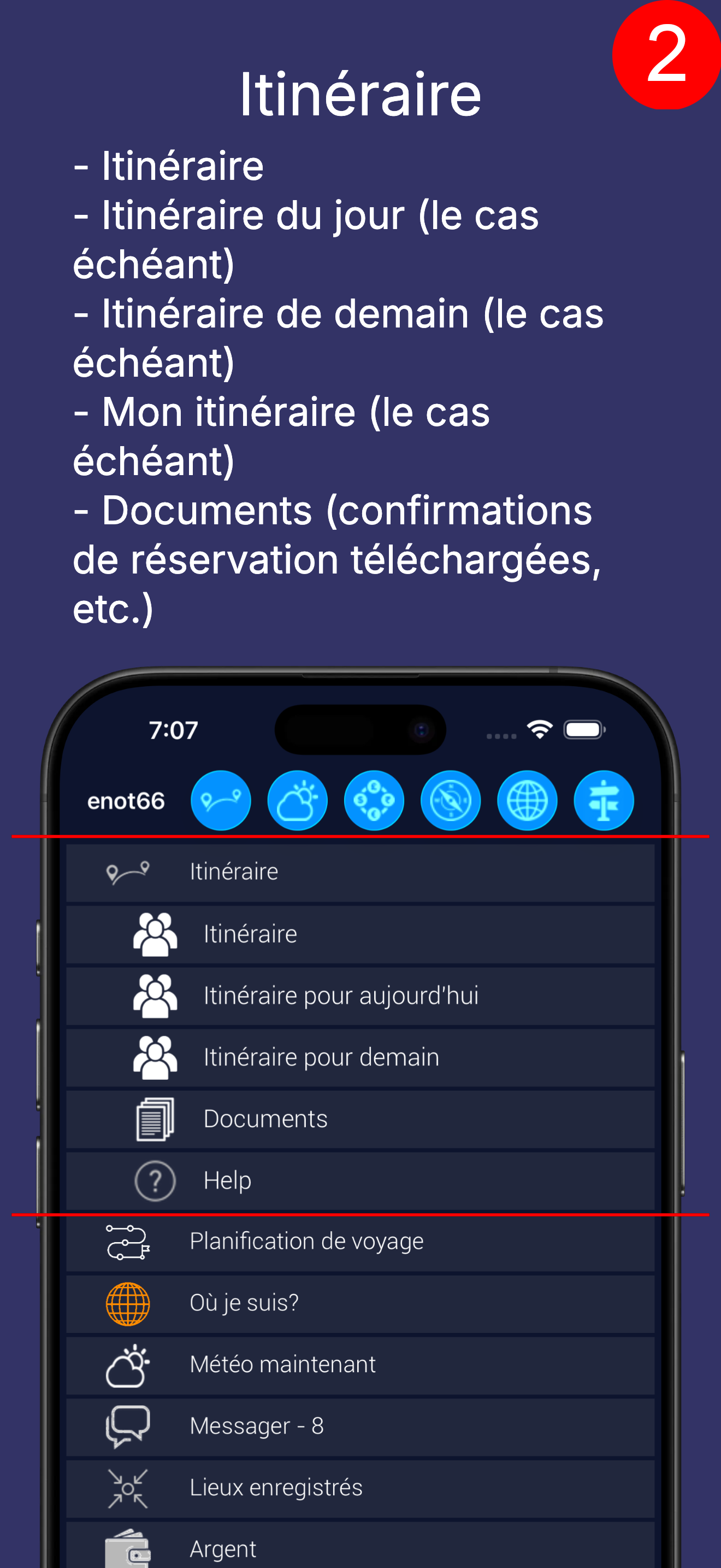 Vous pouvez consulter le plan complet, le plan d'aujourd'hui, celui de demain, les plans personnels (s'ils existent). Et les documents, si vous les avez téléchargés (par exemple, les confirmations de réservation).