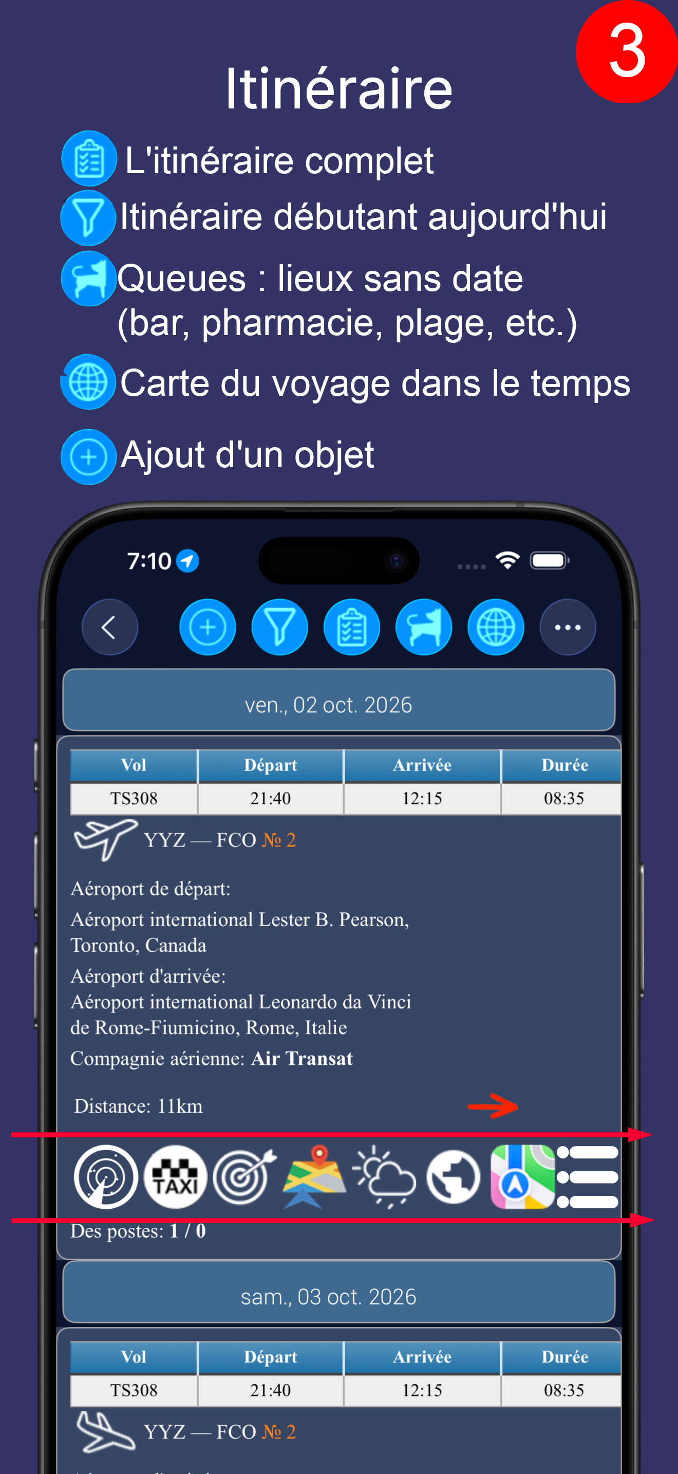 Dans cet exemple, vous voyez une partie du plan de voyage : départ de Toronto le vendredi 2 octobre, arrivée à Rome le 3 octobre (partiellement).