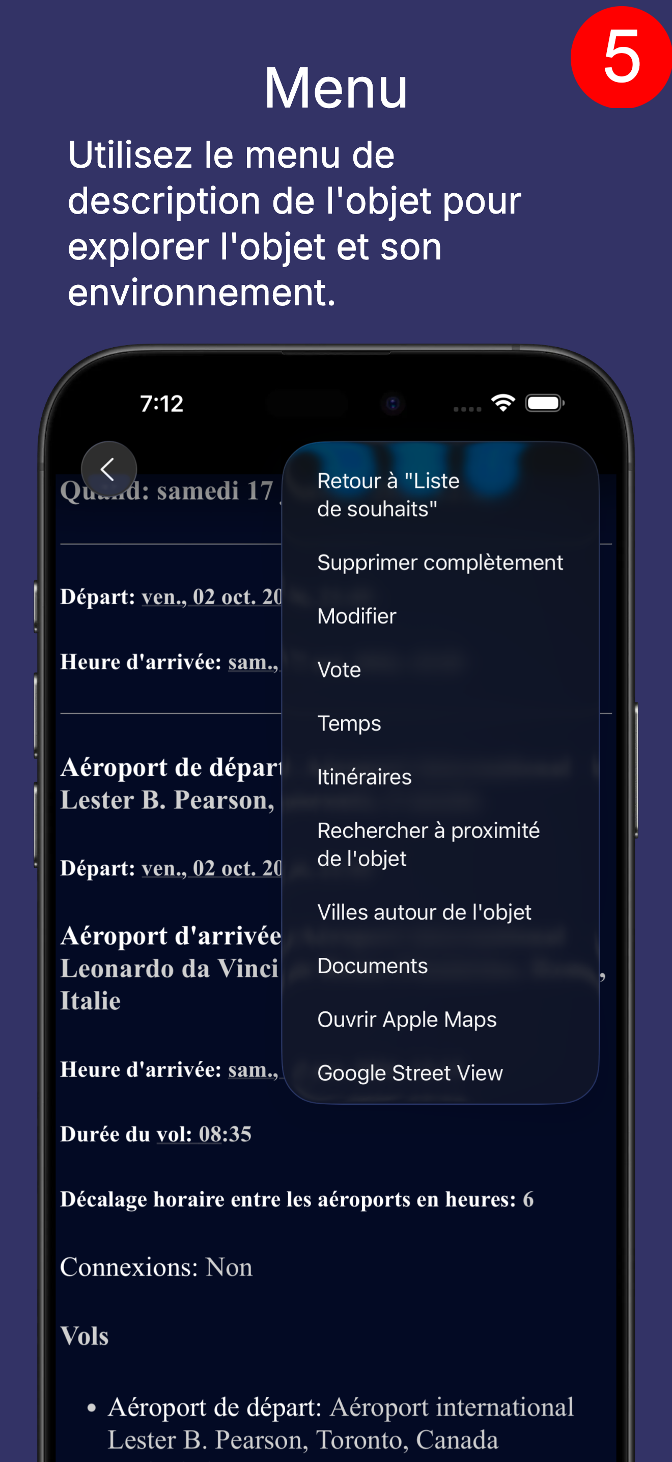 Ce sont des objets que vous avez réservés (par exemple, un vol) ou choisis pour visiter (par exemple, un restaurant, une attraction). Cela ressemble à la « Liste de souhaits ».