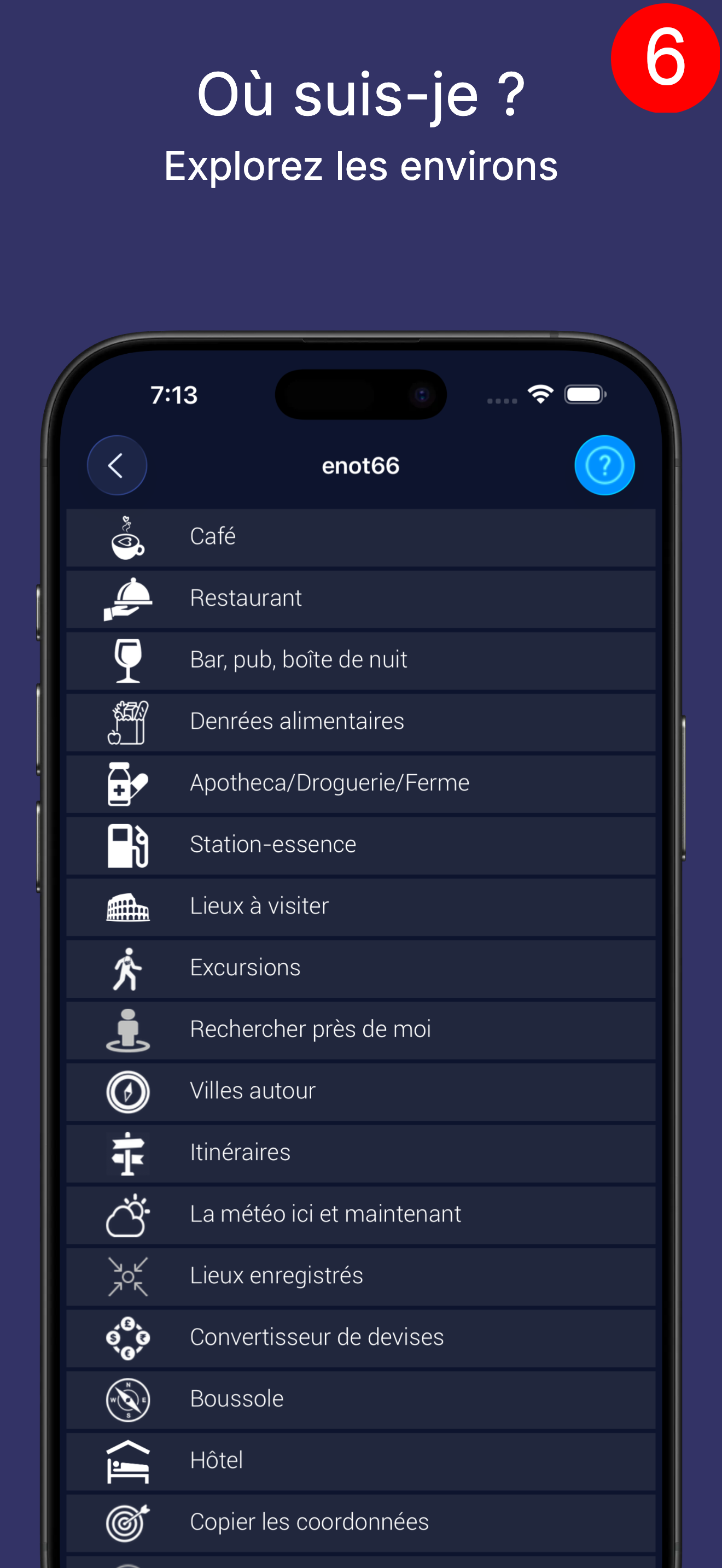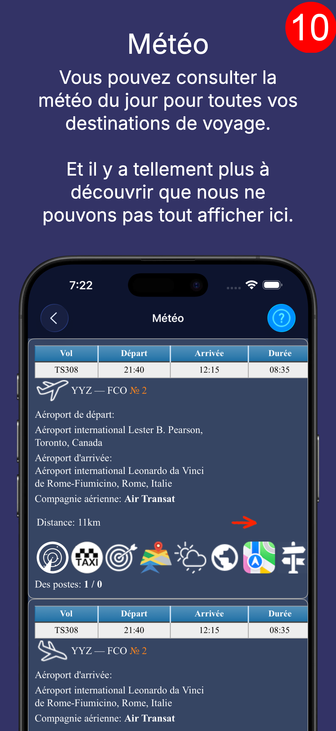 Sur chaque cellule, vous voyez une brève description de l'objet, la distance jusqu'à l'objet et la direction : par exemple, l'aéroport se trouve actuellement à 11 km à l'est de vous.