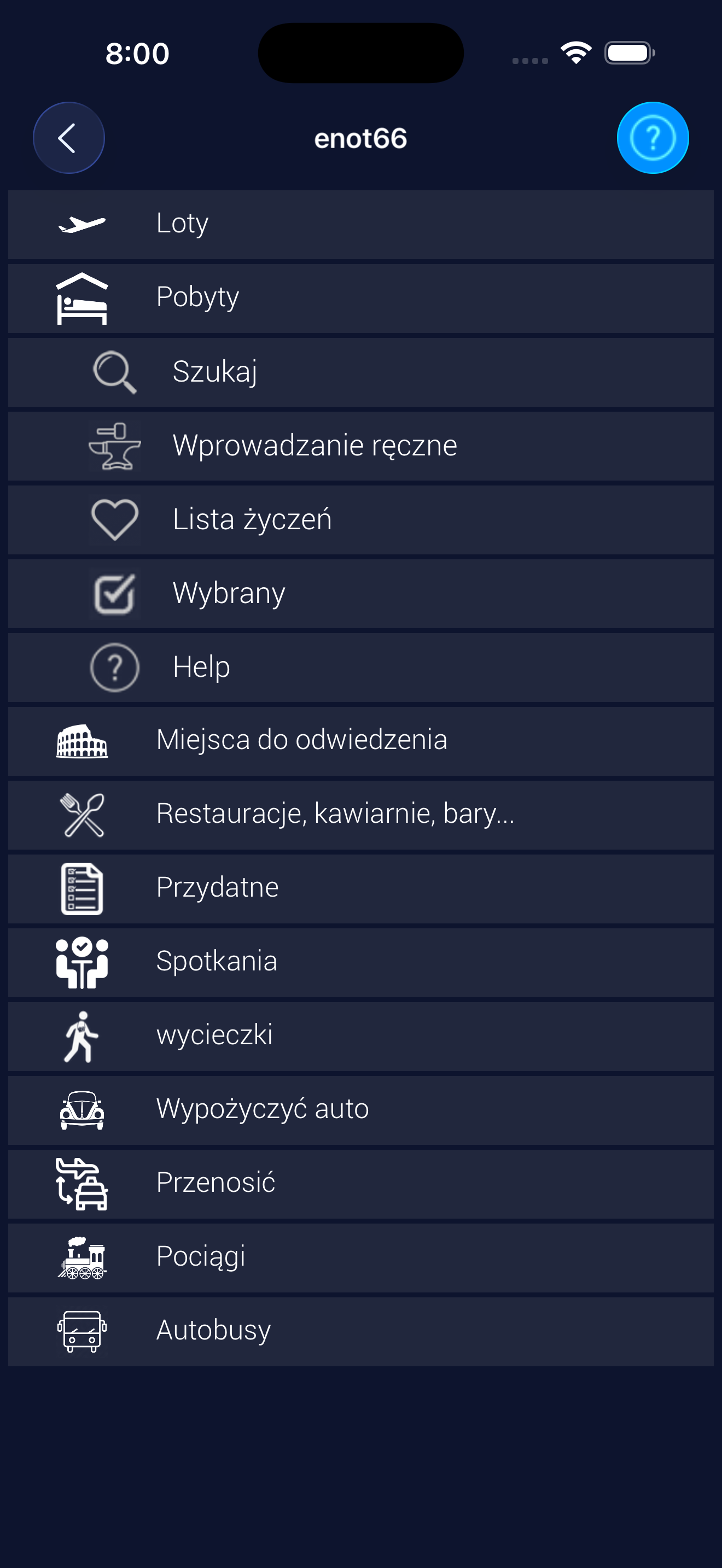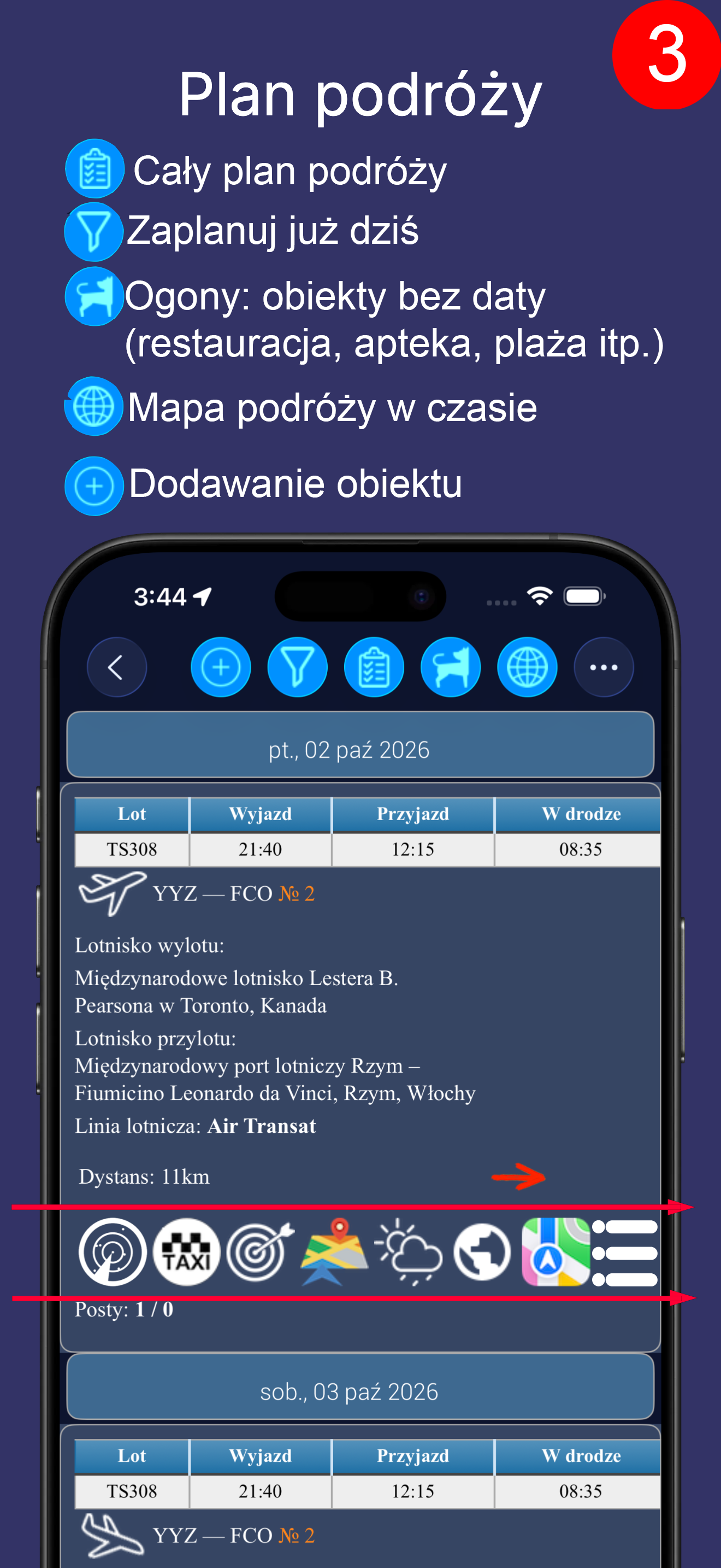 Możesz dodawać obiekty podróży do planu (loty, hotele, wynajem samochodów, atrakcje, autobusy, pociągi, transfery, restauracje itp.) |
