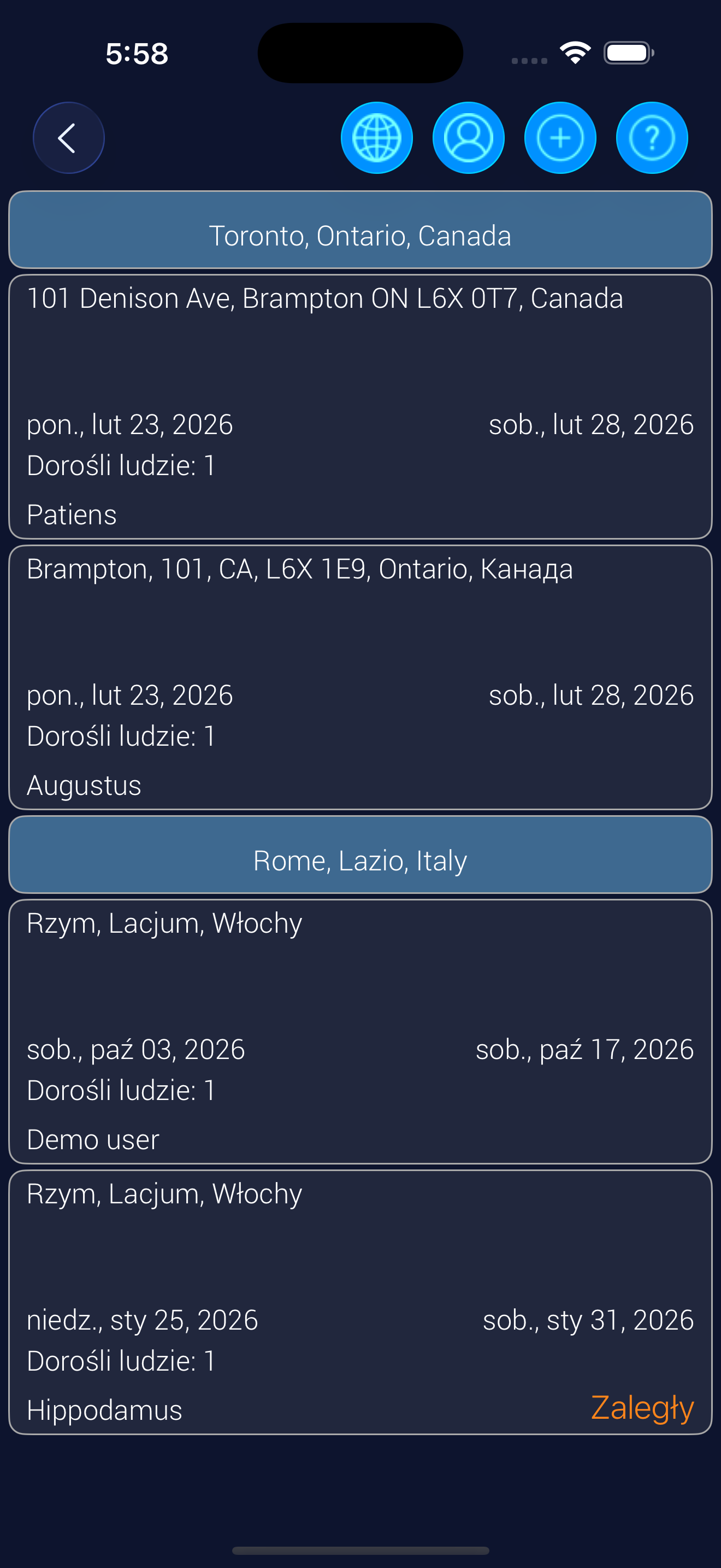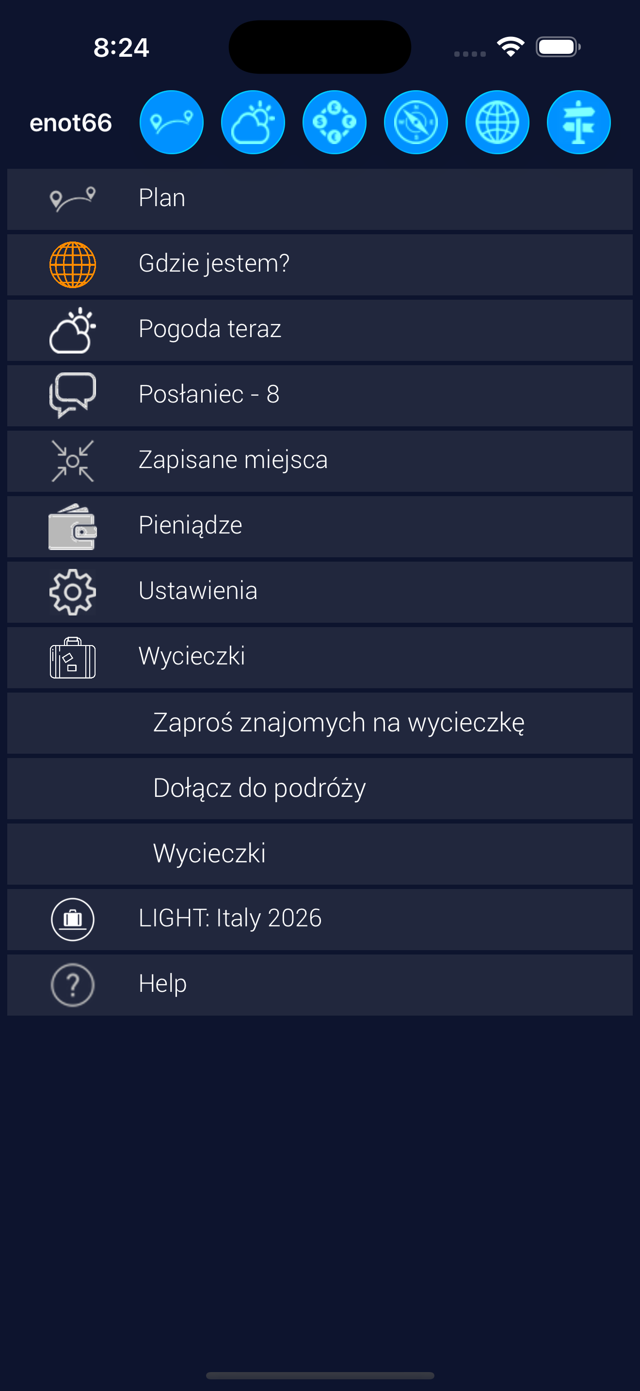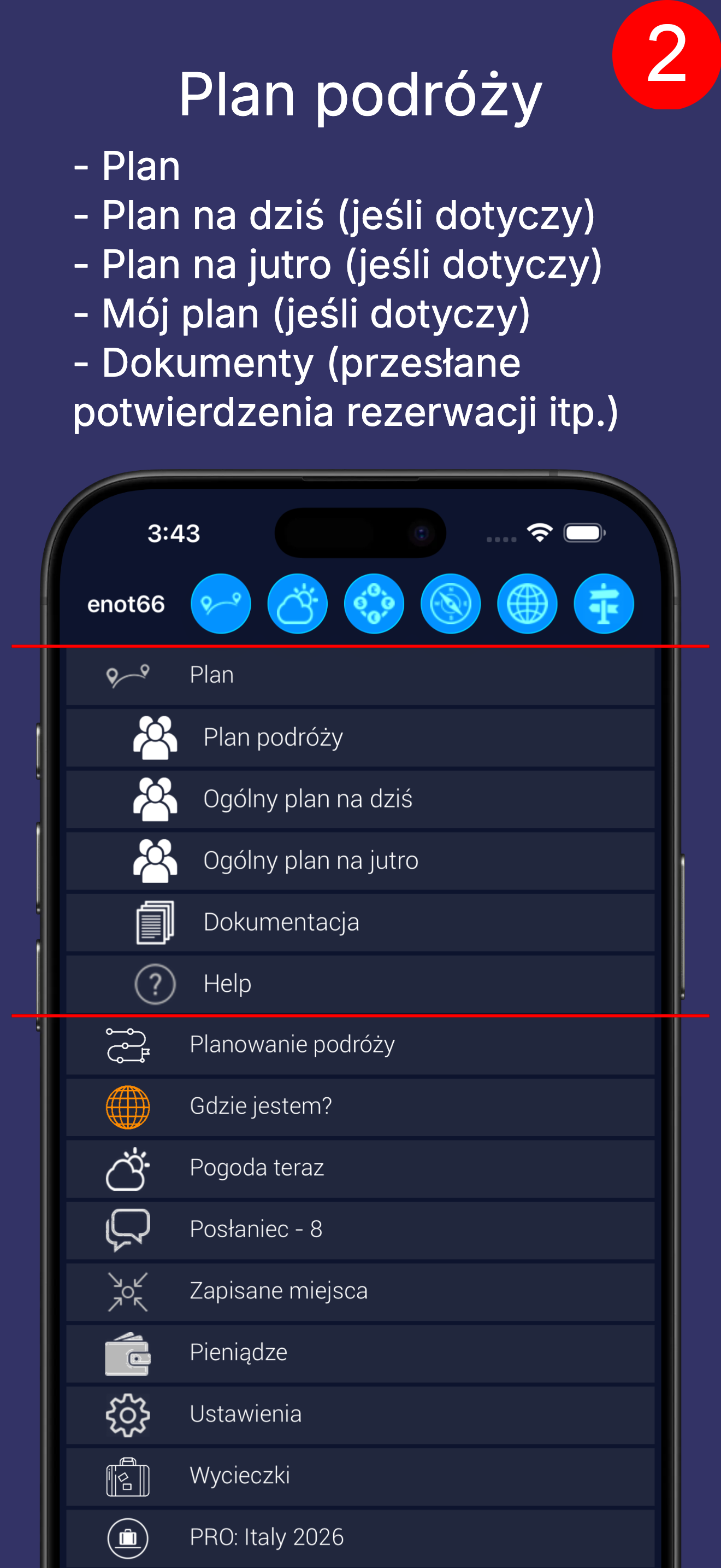 Możesz przeglądać cały plan, plan na dziś, na jutro, plany osobiste (jeśli istnieją). Oraz dokumenty, jeśli je przesłałeś (na przykład potwierdzenia rezerwacji).