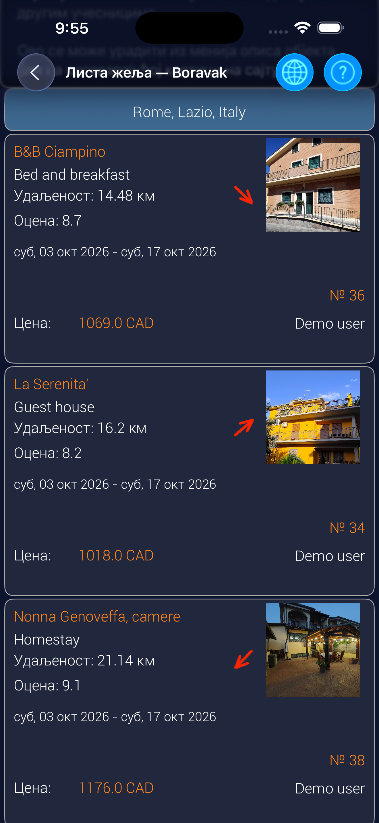 Сваки пронађени објекат може бити додат у „План" у Light режиму или сачуван у „Листу жеља" или „Изабрано" у Pro режиму и постати објекат путовања.