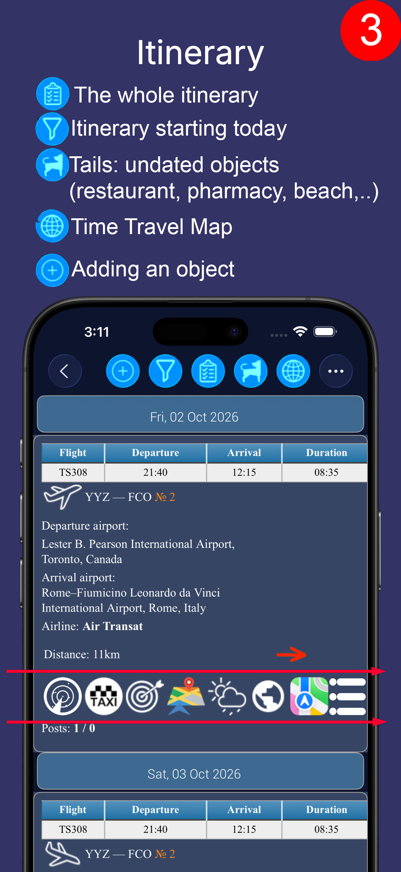 У овом примеру видите део плана путовања: полазак из Торонта у петак 2. октобра, долазак у Рим 3. октобра (делимично).