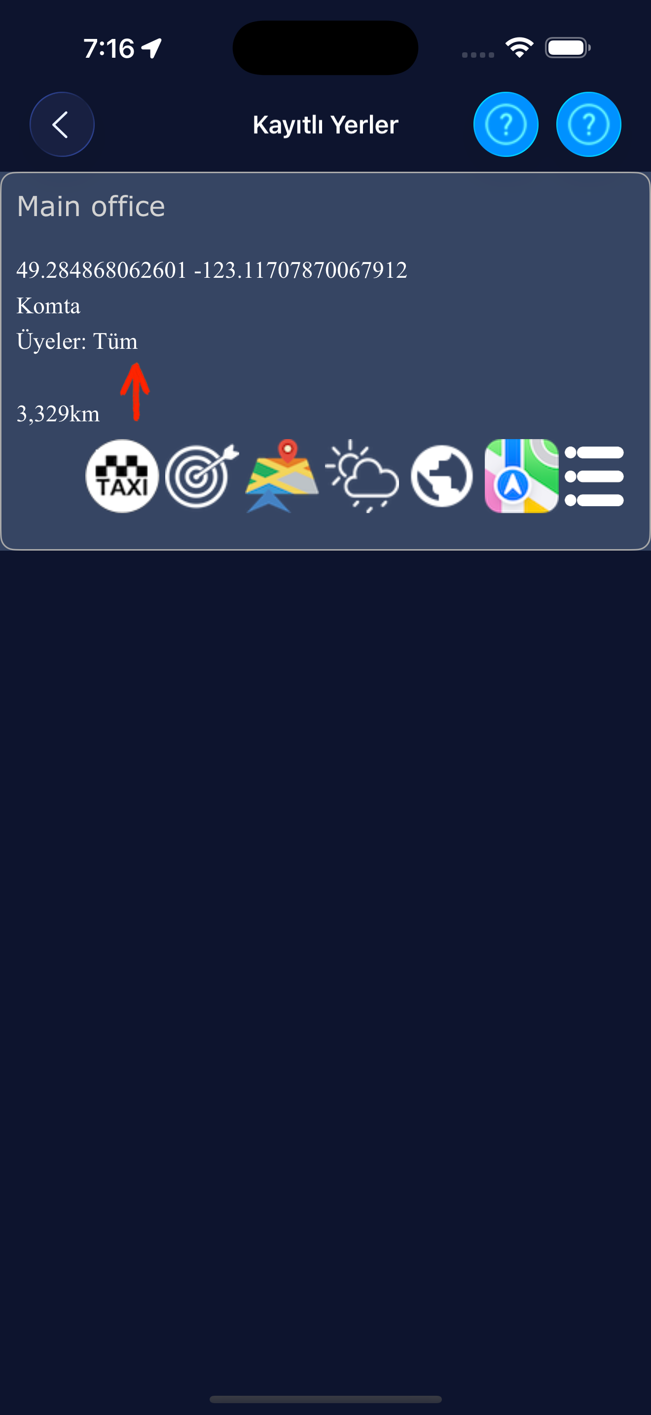 Nesnenin koordinatları ve adresi, örneğin diğer taksi uygulamalarında kullanılmak üzere. |