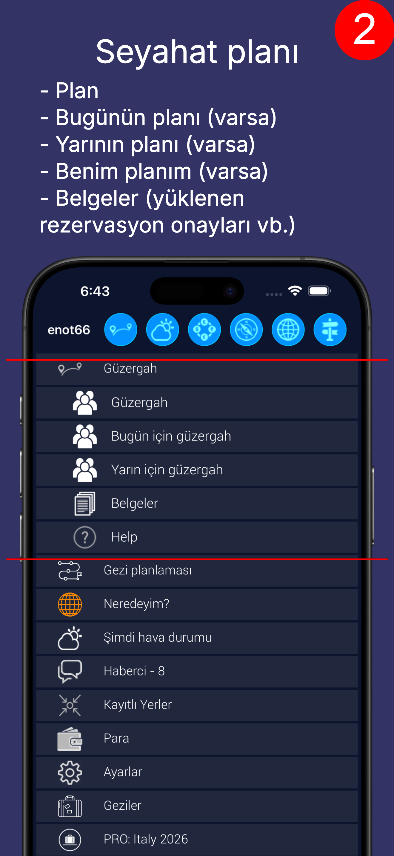 Tüm planı, bugünün planını, yarının planını, kişisel planları (varsa) görüntüleyebilirsiniz. Ve yüklediğiniz belgeleri (örneğin, rezervasyon onayları).